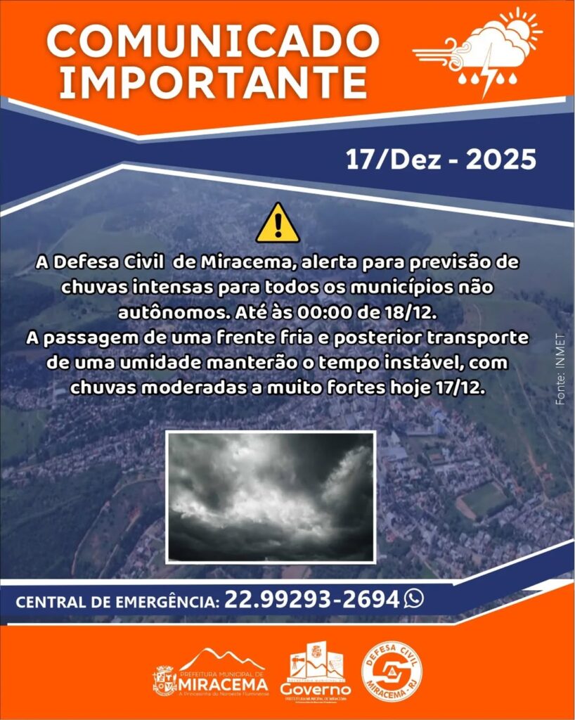 A Defesa Civil de Miracema informa que esta quarta-feira (17/12) será marcada por tempo instável, com alto risco de chuvas intensas, podendo variar de moderadas a muito fortes ao longo do dia.