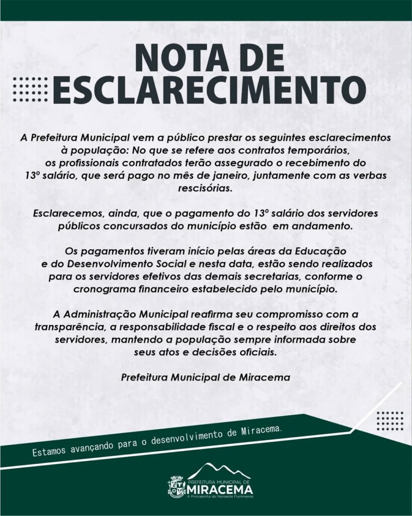 A Prefeitura Municipal vem a público prestar os seguintes esclarecimentos à população: No que se refere aos contratos temporários, os profissionais contratados terão assegurado o recebimento do 13º salário, que será pago no mês de janeiro, juntamente com as verbas