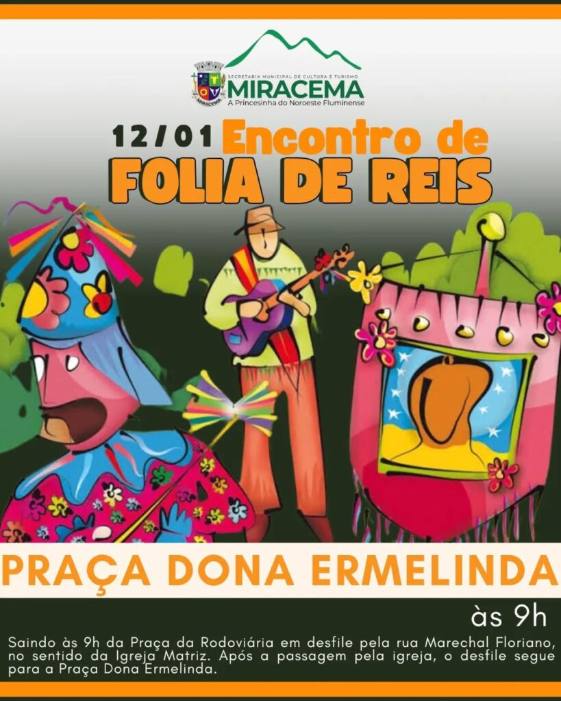 A Secretaria Municipal de Cultura e Turismo de Miracema/RJ convida a todos para o Encontro de Folias, celebrando o rico patrimônio imaterial do nosso município, representado pelas tradicionais Folias de Reis.