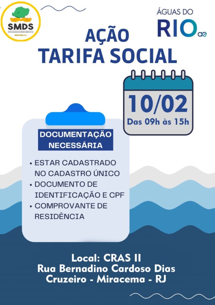 Nesta quinta-feira (10), a Secretaria de Assistência Social e a Empresa Águas do Rio, estarão realizando a Ação Tarifa Social, na sede do CRAS II, na Vila.