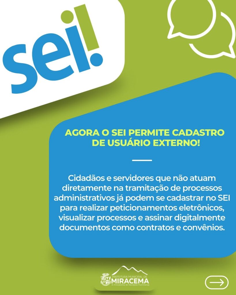 📌 Cidadãos e servidores que não atuam diretamente na tramitação de processos administrativos já podem se cadastrar no SEI para realizar peticionamentos eletrônicos, visualizar processos e assinar digitalmente documentos como contratos e convênios.