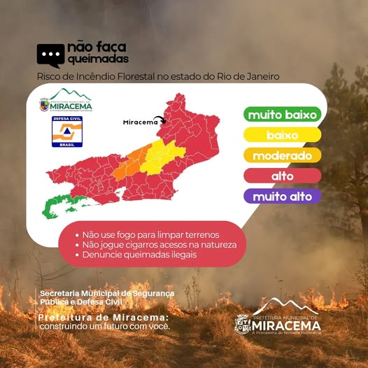 A Prefeitura de Miracema, por meio da Secretaria Municipal de Segurança Pública e Defesa Civil, alerta a população sobre o risco de incêndio florestal no estado do Rio de Janeiro. De acordo com o mapa divulgado, grande parte do território fluminense está em estado de alerta elevado, variando de risco moderado a muito alto.