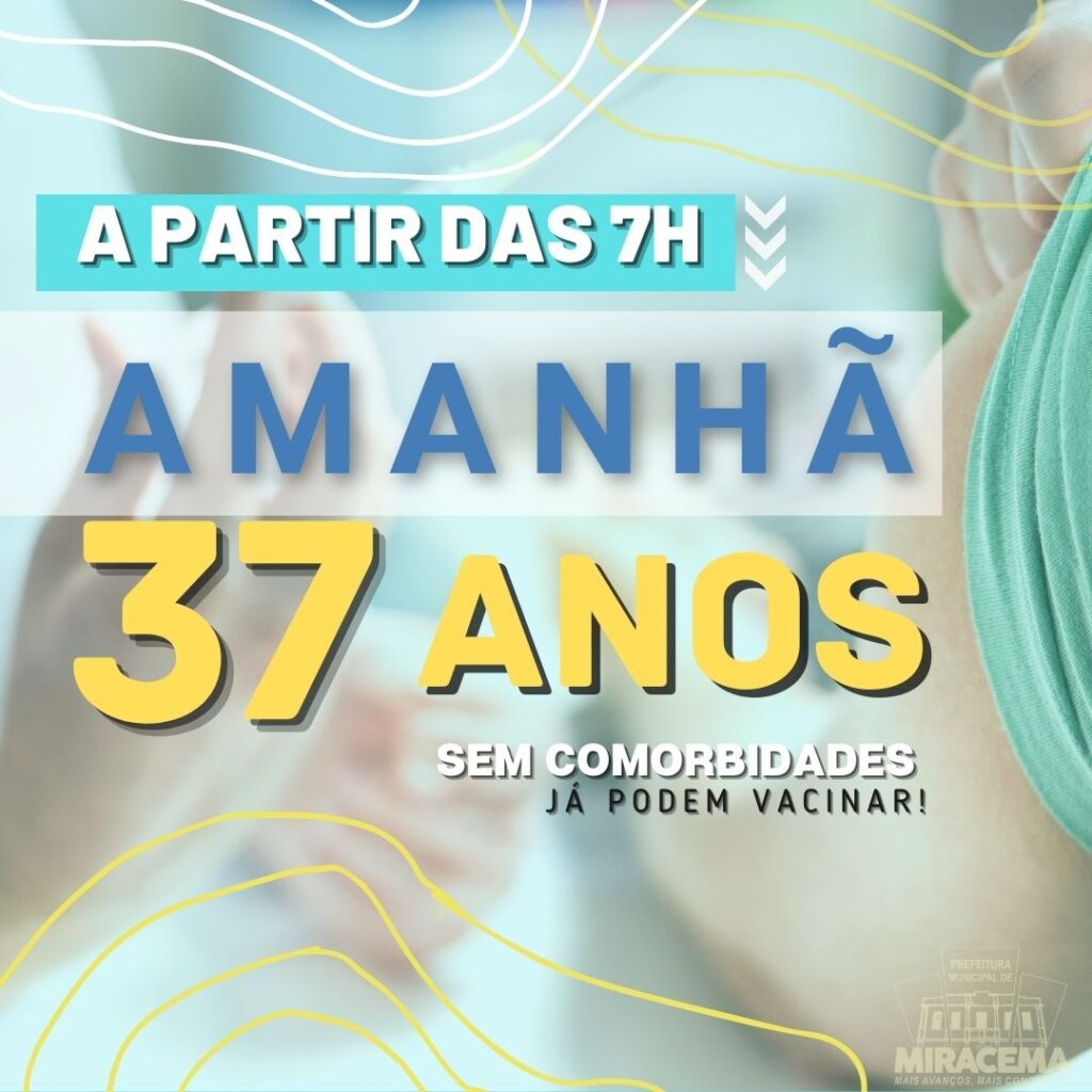 Convocamos os munícipes a partir de 37 anos sem comorbidades para vacinarem contra a COVID-19, amanhã, dia 22/07, a partir das 7h, em uma das nossas unidades de Saúde.
