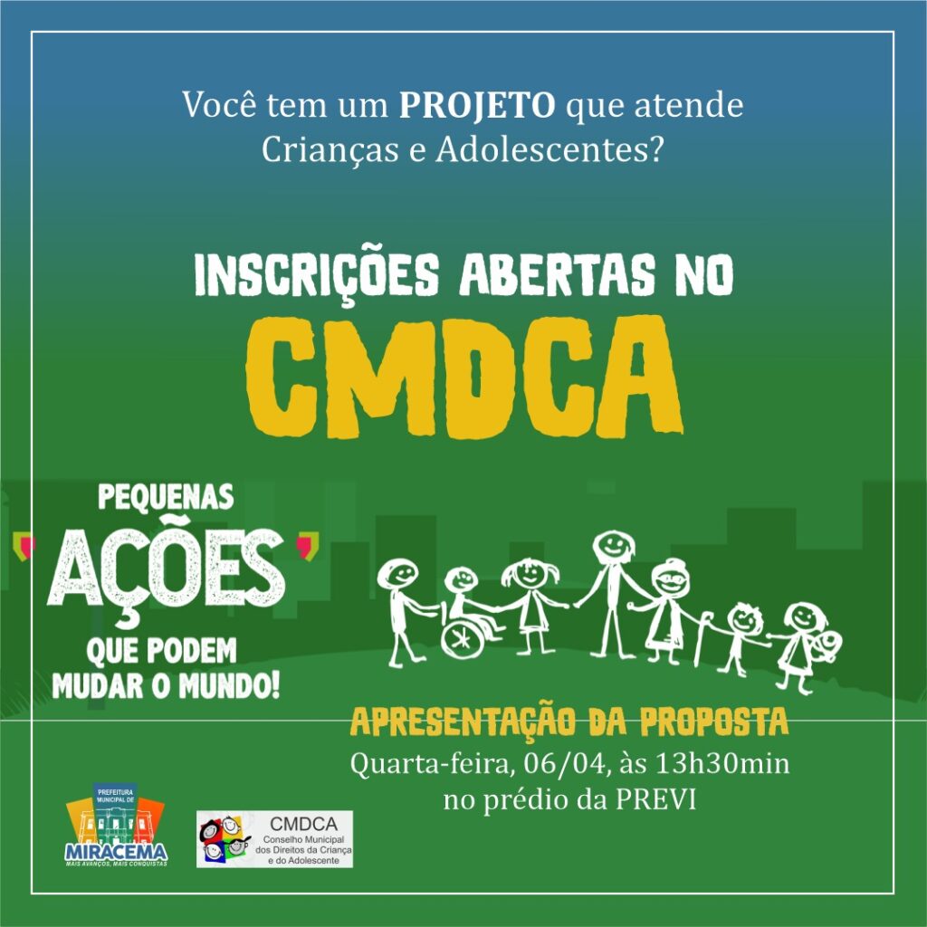 Está aberta a chamada pública para inscrição de projetos. Os envelopes deverão ser entregues à equipe do CMDCA – Conselho Municipal dos Direitos da Criança e do Adolescentes – até o dia 20/04, na rua Matoso Maia, 173 – centro, Miracema.