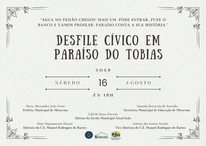 Toda a população está convidada a prestigiar este momento de pertencimento e celebração. Vamos juntos honrar a história de Paraíso do Tobias!