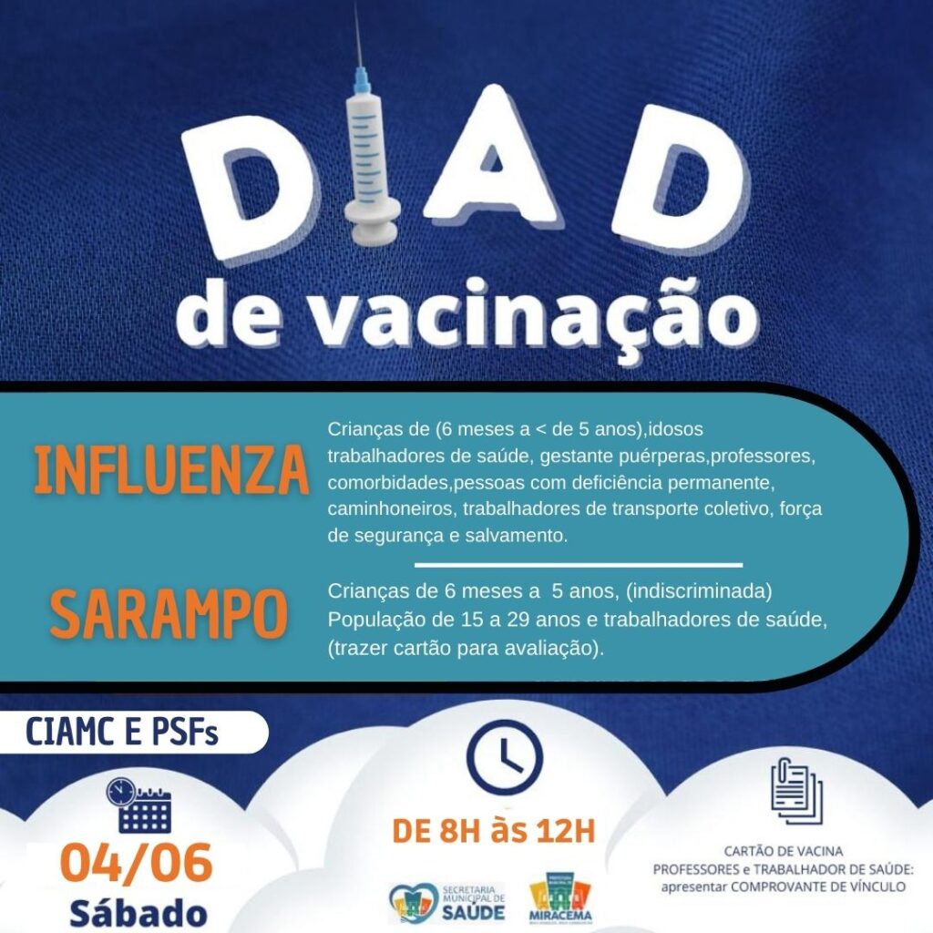 A prefeitura municipal de Miracema, através da secretaria de saúde, informa que neste sábado, 04/06, ocorrerá a campanha de vacinação contra a influenza e o sarampo em todos os PSF’s e no CIAMC.