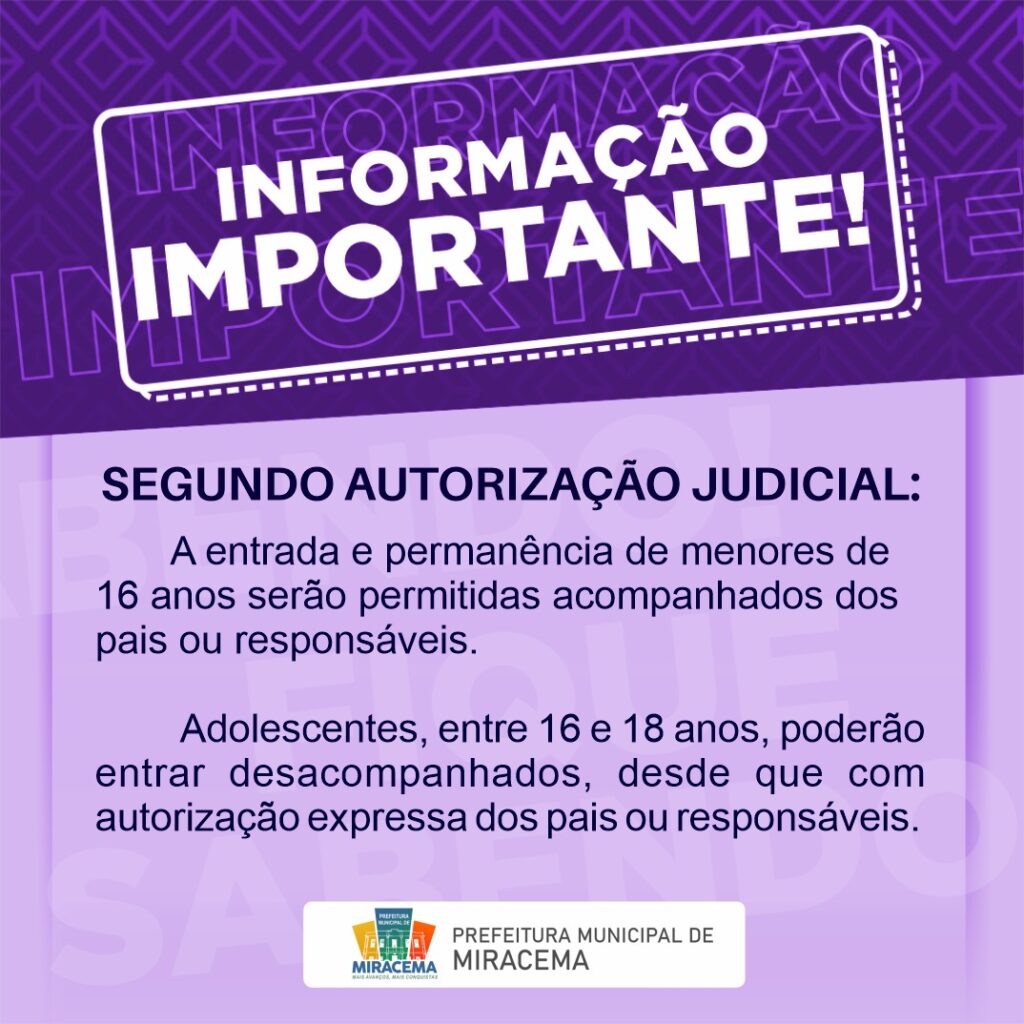 Seguindo orientações judiciais, a entrada e a permanência de menores de 16 anos será permitida mediante o acompanhamento dos pais ou responsáveis.