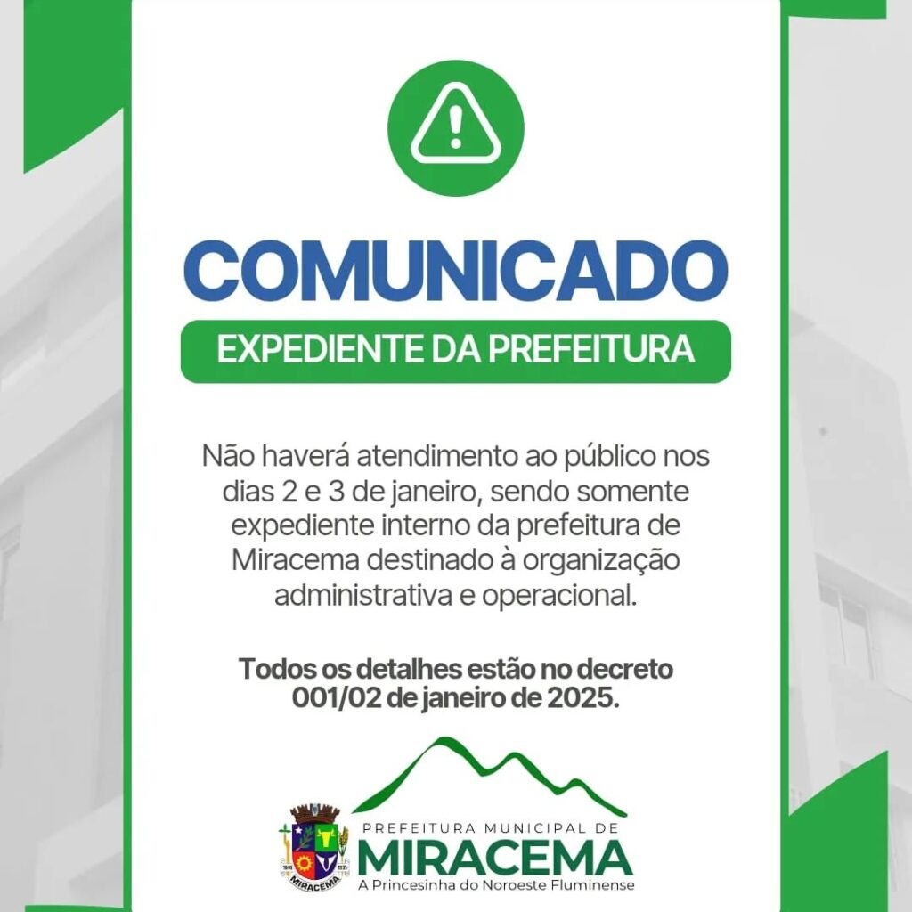 A Prefeitura Municipal de Miracema informa que, conforme o Decreto nº 001, de 2 de janeiro de 2025, o expediente de atendimento ao público estará suspenso nos dias 2 e 3 de janeiro de 2025.