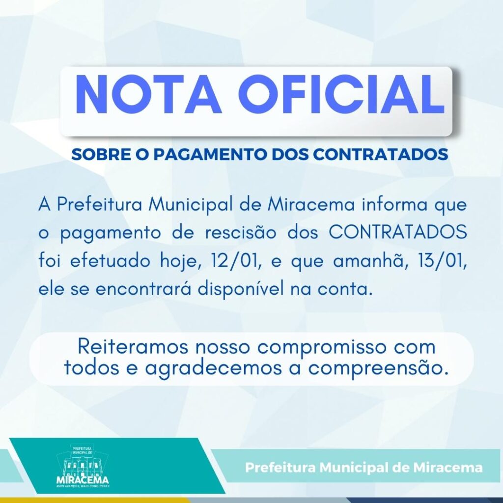 A Prefeitura Municipal de Miracema informa que o pagamento de rescisão dos CONTRATADOS foi efetuado hoje, 12/01, e que amanhã, 13/01, ele se encontrará disponível na conta.
