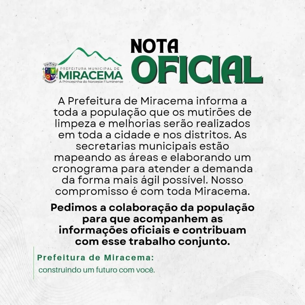 Nosso compromisso é garantir um ambiente mais limpo, seguro e organizado para todos os miracemenses. Pedimos a colaboração da população para que acompanhem as informações oficiais e contribuam com esse trabalho conjunto.