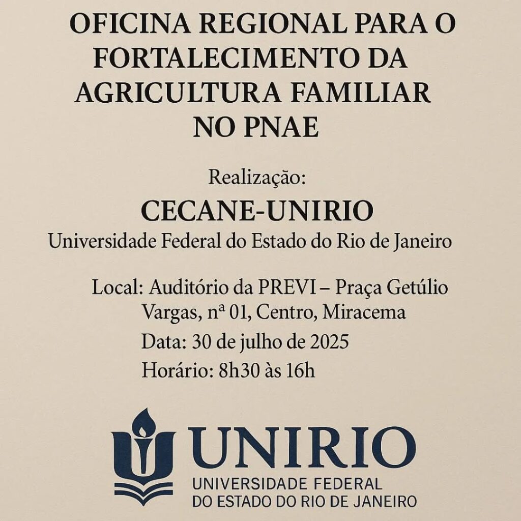 No dia 30 de julho de 2025, o Auditório da PREVI, na Praça Getúlio Vargas, nº 01, no Centro, receberá a Oficina Regional para o Fortalecimento da Agricultura Familiar no PNAE (Programa Nacional de Alimentação Escolar). O evento será realizado pelo CECANE-UNIRIO, vinculado à Universidade Federal do Estado do Rio de Janeiro.