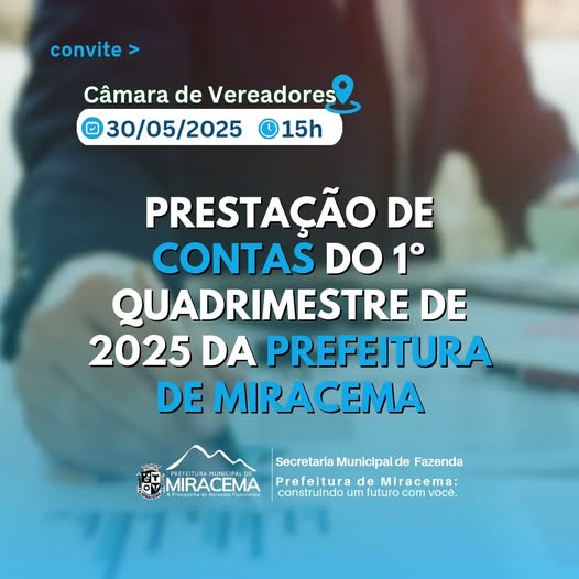 A Secretaria Municipal de Fazenda convida a população para acompanhar, nesta sexta-feira (30), às 15h, na Câmara de Vereadores, a prestação de contas da Prefeitura de Miracema, referente ao 1º quadrimestre de 2025.