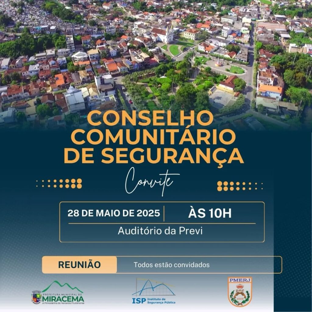A Prefeitura de Miracema convida a população para participar da próxima reunião do Conselho Comunitário de Segurança, que acontecerá na quarta-feira (28/05), às 10h, no Auditório da Previ.