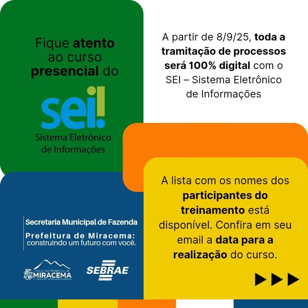 A Prefeitura de Miracema reforça que cada servidor precisa verificar em seu e-mail a data de participação no curso presencial do SEI – Sistema Eletrônico de Informações, que será realizado nos dias 3 ou 4 de setembro de 2025 (confira a lista), no Centro Cultural Melchiádes Cardoso, das 9h às 18h.