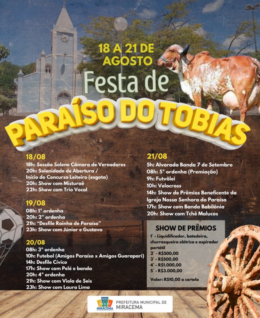A prefeitura municipal de Miracema informa que, entre os dias 18/08 a 21/08, o distrito de Paraíso do Tobias estará em festa!