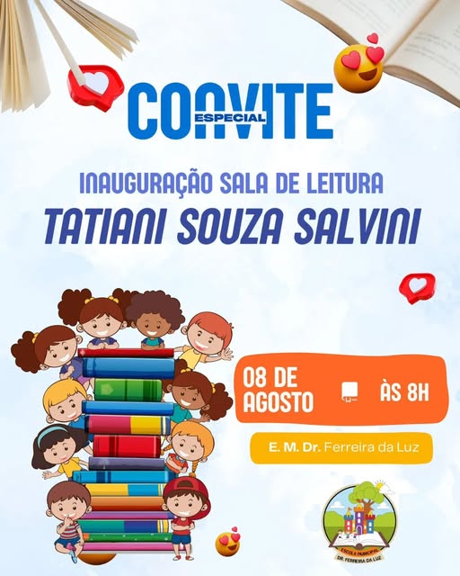 Na próxim quinta-feira (08/08), às 8h, a Prefeitura de Miracema, por meio da Secretaria Municipal de Educação, convida toda a comunidade para a inauguração da Sala de Leitura Tatiani Souza Salvini, na Escola Municipal Dr. Ferreira da Luz.